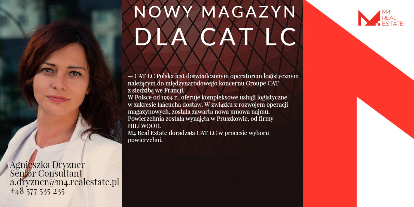 CAT LC Polska jest doświadczonym operatorem logistycznym należącym do międzynarodowego koncernu Groupe CAT z siedzibą we Francji.nnW Polsce od 1994 r. oferuje kompleksowe usługi logistyczne w zakresie łańcucha dostaw. W związku z rozwojem operacji magazynowych, została zawarta nowa umowa najmu. Powierzchnia została wynajęta w Pruszkowie, od firmy HILLWOOD.nnM4 Real Estate doradzała CAT LC w procesie wyboru powierzchni.